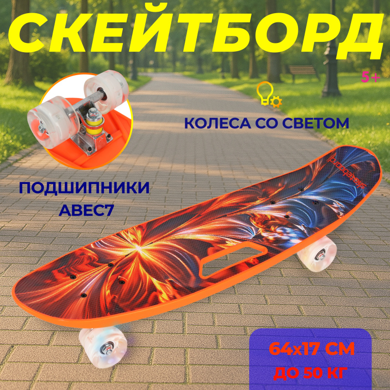 Скейт PU все колеса светятся пластмасса, пакет, цвет оранжевый 25"- 64 см 0Ц-00121444